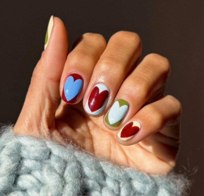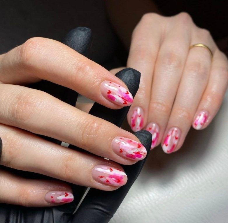 Импрессионизм на кончиках пальцев, дополненный микросердечками, – яркий маникюр для творческих личностей.