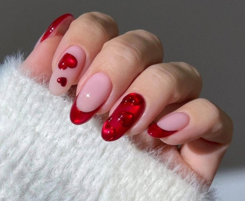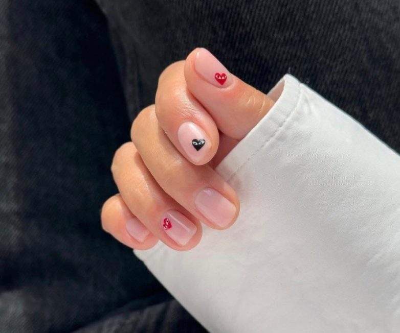 Подходящий вариант для тех, кому не надоедает нюд или классический френч, – добавить романтичные сердечки миниатюрного размера на один или два ногтя. Смотрится эстетично и не перегружает образ – особенно, если поиграть с текстурами, замиксовав красный или розовый с хромированным лаком (золотом или серебром).