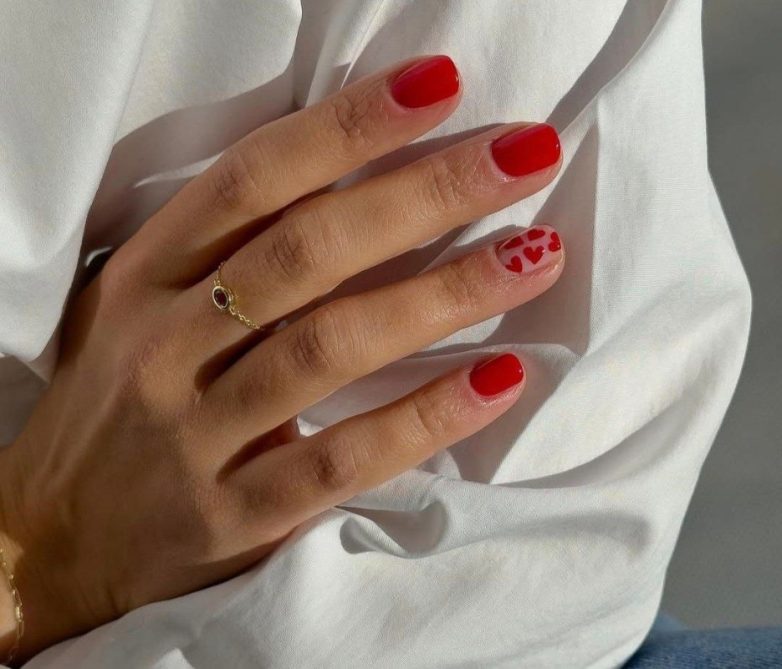 Классический красный, но с маленьким праздничным нюансом – один ноготь украшен сердечками в тон всему маникюру. Смотрится стильно и дорого.