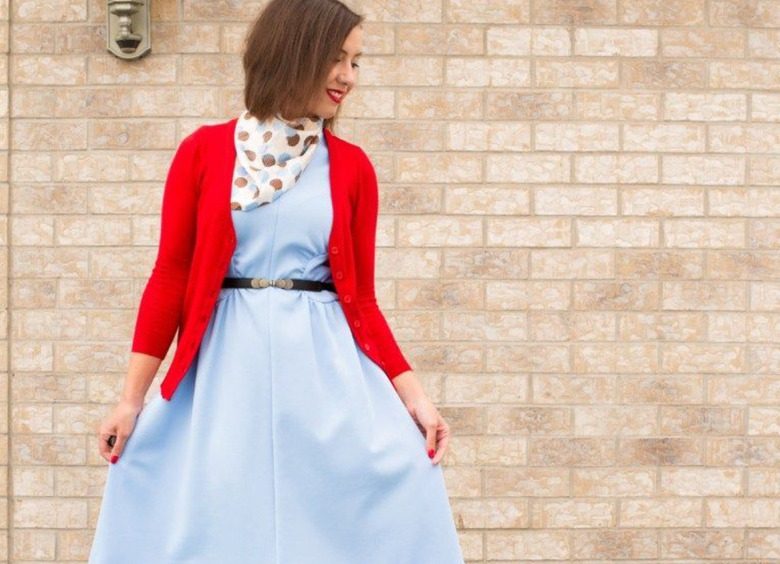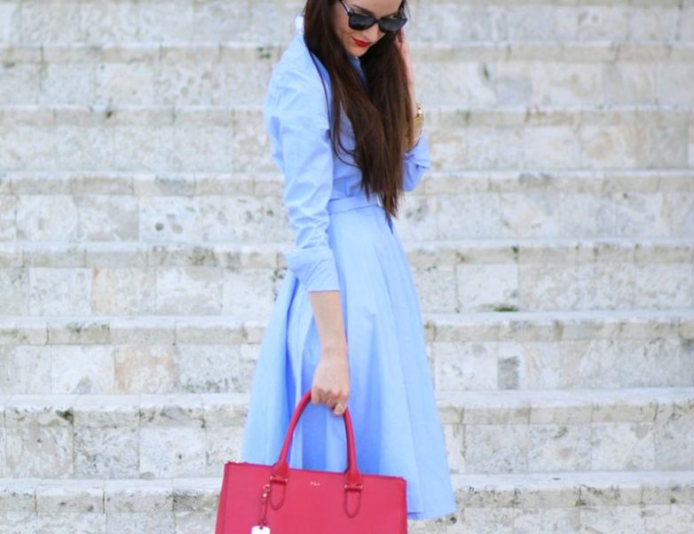 Для более смелых подойдет полноценное сочетание в одежде, когда оба цвета звучат на равных. Голубой костюм с алым топом, голубая юбка с красным жакетом, двухцветные платья. Чтобы образ выглядел современно, важна чистота оттенков: голубой — холодный, ясный, а алый — насыщенный, без ухода в бордо или коралл.