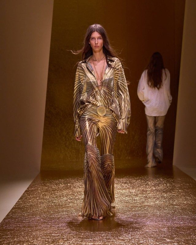 Да, леопарда наконец можно отложить в сторону. В 2026 мы будем интегрировать в образы полоски, пятна и имитацию кожи змеи. Лучше всего такие принты выглядят в платьях-комбинациях, прямых юбках миди, блузах и костюмах из плотной ткани. Эффективный вариант – собрать монообраз с одним принтом, но с моделями максимально простого кроя, например свободные, слегка расклешенные брюки и прямая удлиненная рубашка с коротким рукавом.