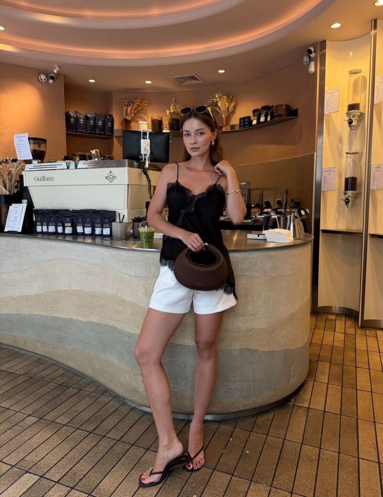 Для летних образов топ в бельевом стиле отлично смотрится с шортами из легких тканей: хлопок, лен или мягкий деним. Топ можно носить навыпуск, чтобы подчеркнуть кружевные детали, или заправить, чтобы сделать талию визуально стройнее. Комплект подходит для прогулок, летних встреч и городских образов. Обувь и аксессуары подбираются в зависимости от настроения: сандалии или эспадрильи — для повседневного образа, туфли на каблуке — для вечернего выхода. Сумка или клатч завершат образ.