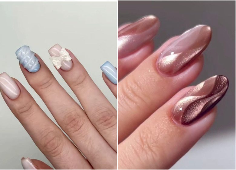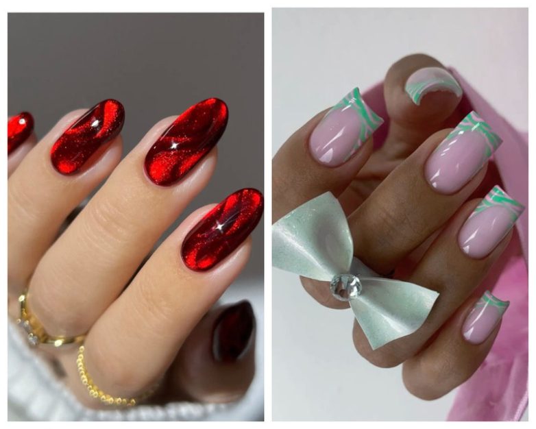 Для смелых натур актуальны объемные украшения: мелкие жемчужины, цепочки и текстурные элементы. И здесь тоже работает правило одного акцента — декор размещается только на одном-двух пальцах.
