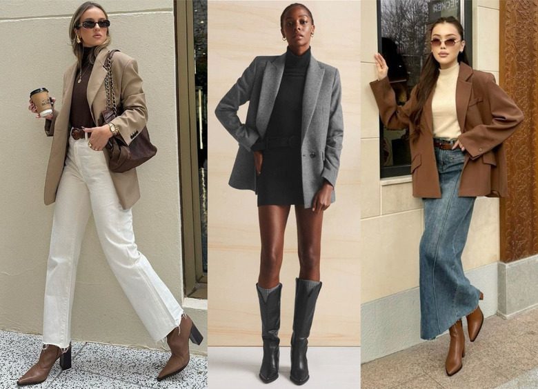 В более формальном контексте казаки хорошо сочетаются с прямыми костюмными брюками и жакетом. Здесь важна чистая линия обуви — без вышивки и активного декора. Брюки лучше с небольшим заужением к низу, чтобы оставить голенище на виду.
