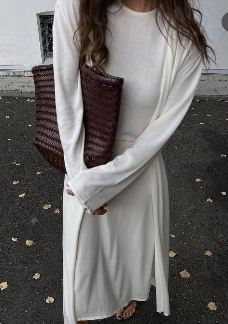 Уют, как в любимой пижаме, но выглядит как полноценный наряд, в чем нас убеждают коллекции The Row, Gabriela Hearst и Ula Johnson. Прямой силуэт не облегает, позволяет телу дышать, а миди длина добавляет элегантности. Материал — мягкий трикотаж с кашемиром или вискозой — теплый, не мнется и красиво драпируется. Носите с кроссовками для кэжуал стиля или с ботильонами для офиса.
