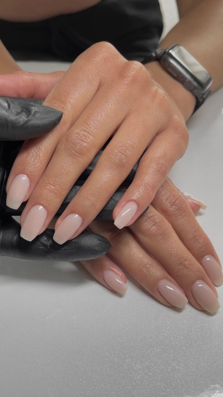 Ледяной беж с едва заметной серым подтоном создает эффект прозрачной ногтевой пластины. На холодной коже лак почти сливается с тоном руки, удлиняя ноготь, а на теплой — сохраняет чистую линию, не перегружая форму.