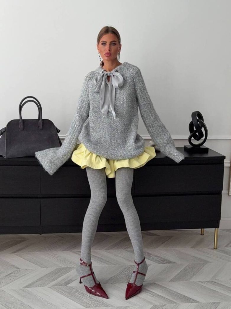 «Движемся от самых ярких, на удивление, к не очень ярким и бледным. И серые колготки тому доказательство. Они могут как дополнять образ, так и служить акцентом», — подчеркивает стилист.